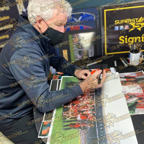 This stunning, extra large picture shows the cup winning team celebrating their victory and has been signed by two all-time Manchester United legends. Captian Marvel Bryan Robson and the magnificent Welsh striker Mark Hughes – exclusivley for Superstar Speakers